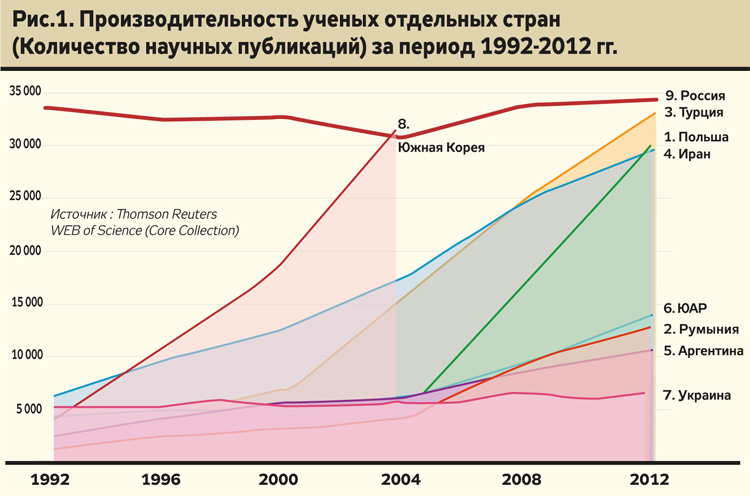 Читатель легко заметит, что в начале независимости Украина, издав 5105 научных трудов, в 1992 г. опережала по продуктивности все эти страны, кроме Польши (но и здесь отставание было незначительным). Более того, оказывается, что 20 лет назад наука в Иране была в зачаточном состоянии (262 научных работы во всех отраслях науки за 1992 г.), а успехи ученых Румынии и Турции были просто смехотворны по сравнению с нашими. И вот прошло 20 лет: ученые Украины опубликовали 6317 научных работ (из них ученые НАНУ - почти 4300), то есть всего на 20% больше, чем в 1992 г. Темпы роста позорно низкие по сравнению со странами-конкурентами: теперь Украина продуцирует в пять раз (!!!) меньше научных работ, чем Иран или Турция, и почти вдвое меньше, чем Румыния. Все остальные страны также успешно "обставили" Украину, а Южная Корея за это время ворвалась в число мировых лидеров: 63341 работа в 2012 году, то есть в 10 раз больше, чем сподобилась Украина. Абсолютно очевиден факт, что в ближайшие десятилетия Украина не имеет никаких шансов вернуть себе то место, которое она занимала в мировом научном сообществе 20 лет назад. К сожалению, в науке значительно труднее сделать качественный скачок, чем в футболе, в котором достаточно вложить миллиард долларов в клуб, и он уже через несколько лет "гремит" по всему миру (яркий пример - английский "Манчестер Сити").