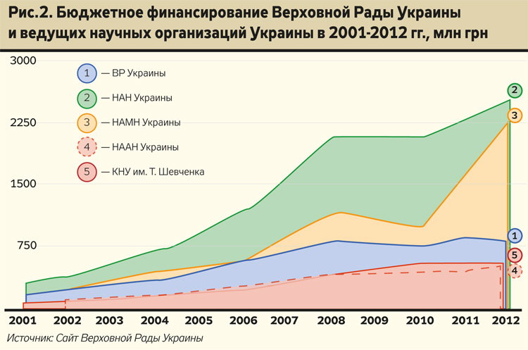 Рис.2. Бюджетное финансирование (в млн грн) ведущих научных организаций Украины и Верховной Рады Украины в 2001–2012 гг: кривая 1 - ВР Украины, 2 - НАН, 3 - НАМН, 4 - НААН, 5 - КНУ им. Т.Шевченко. Источник: Сайт Верховной Рады Украины