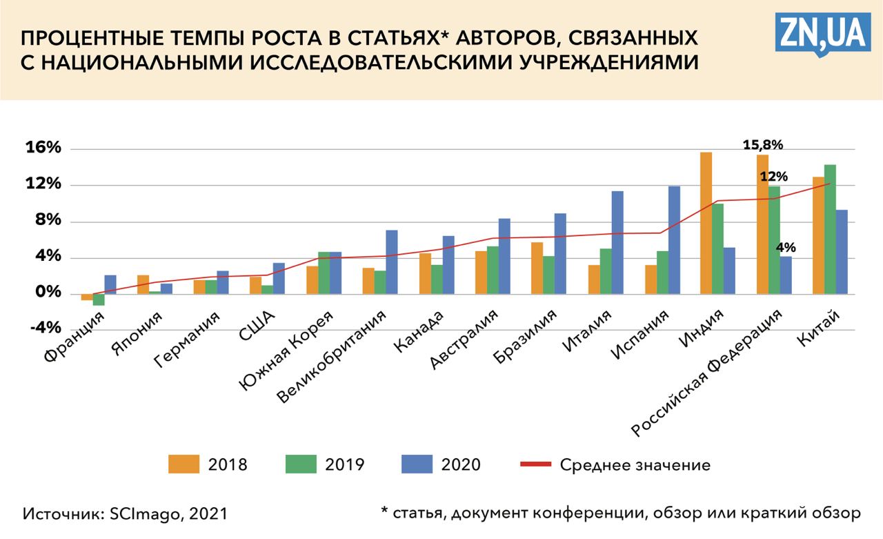 Начали россияне свою операцию по захвату научного мира, так сказать, за здравие, выдав за 2018 год почти 16% прироста и став вместе с Индией лидерами по темпам прироста публикаций в мире. Если бы такими темпами двигались и дальше, то в 2024 году, может, и захватили бы весь научный мир. Но уже в следующем, 2019-м, году что-то притихли, зафиксировав 12% прироста, а в 2020-м вообще сдулись — лишь 4%.