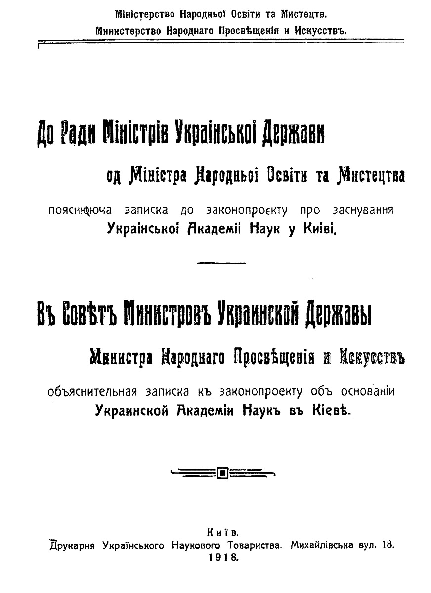 Эти отрывки из объяснительной записки (октябрь 1918 г.) министра народного образования и искусств Украинского Государства Николая Василенко к законопроекту об учреждении Украинской академии наук вызывают довольно сложные чувства. Стилистический колорит и патетические обороты невольно выказывают нервный пульс эпохи, неудержимый порыв мысли, долгожданное предчувствие триумфа и боязни за неизвестное будущее...