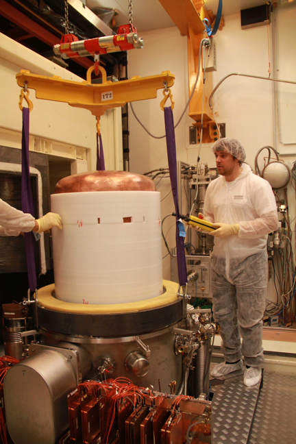 Рис. 4 Сборки с кристаллами молибдата лития, смонтированные в сверхнизкофоновом криостате в подземной лаборатории Модан во Франции. Для нормальной работы кристаллы необходимо охладить до температуры около двух сотых градуса выше абсолютного нуля, окружить толстым слоем защиты и разместить глубоко под Землей