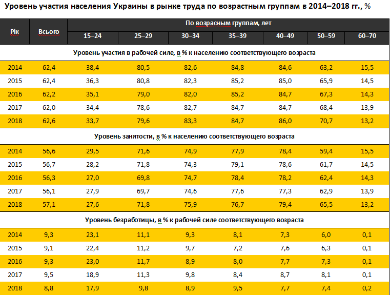 Если визуализировать распределение населения Украины по статусу на рынке труда в виде, подобном традиционной половозрастной пирамиде, то эта пирамида окажется перевернутой (см. рис.). Самая молодая группа трудоспособного возраста, формирующая основание "пирамиды", - молодые люди в возрасте 15–24 года, из когорт родившихся во второй половине 1990-х - начале 2000-х, то есть в годы самой низкой рождаемости, когда суммарный коэффициент рождаемости достигал экстремальных значений 1–1,2 ребенка на одну женщину. По сравнению с 10-летними интервалами 25–34 или 30–39 лет численность возрастной группы 15–24 года меньше почти на 40%. По сравнению с группами 40–49 и 50–59 лет численность группы 15–24 года меньше почти на 30% и даже по сравнению с самой старшей группой 60–70 лет - на более чем 20%.