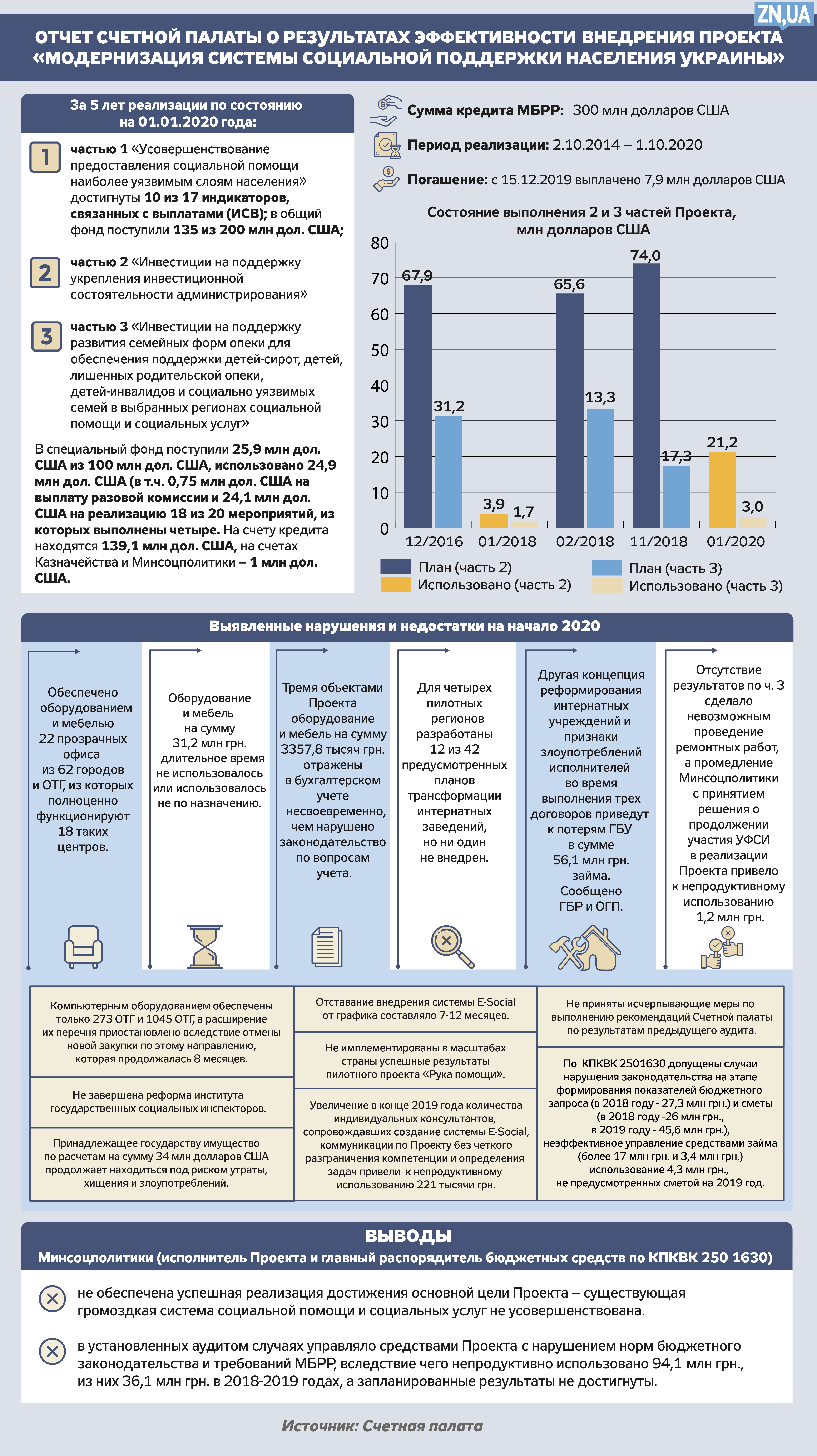 До завершения проекта (октябрь 2020-го) осталось четыре с половиной месяца. Главный вывод Счетной палаты, недавно проводившей очередной аудит эффективности проекта (ответственный - Василий Невидомый), - Минсоцполитики основной цели проекта не достигло, громоздкая система социальной помощи и социальных услуг усовершенствована не была.