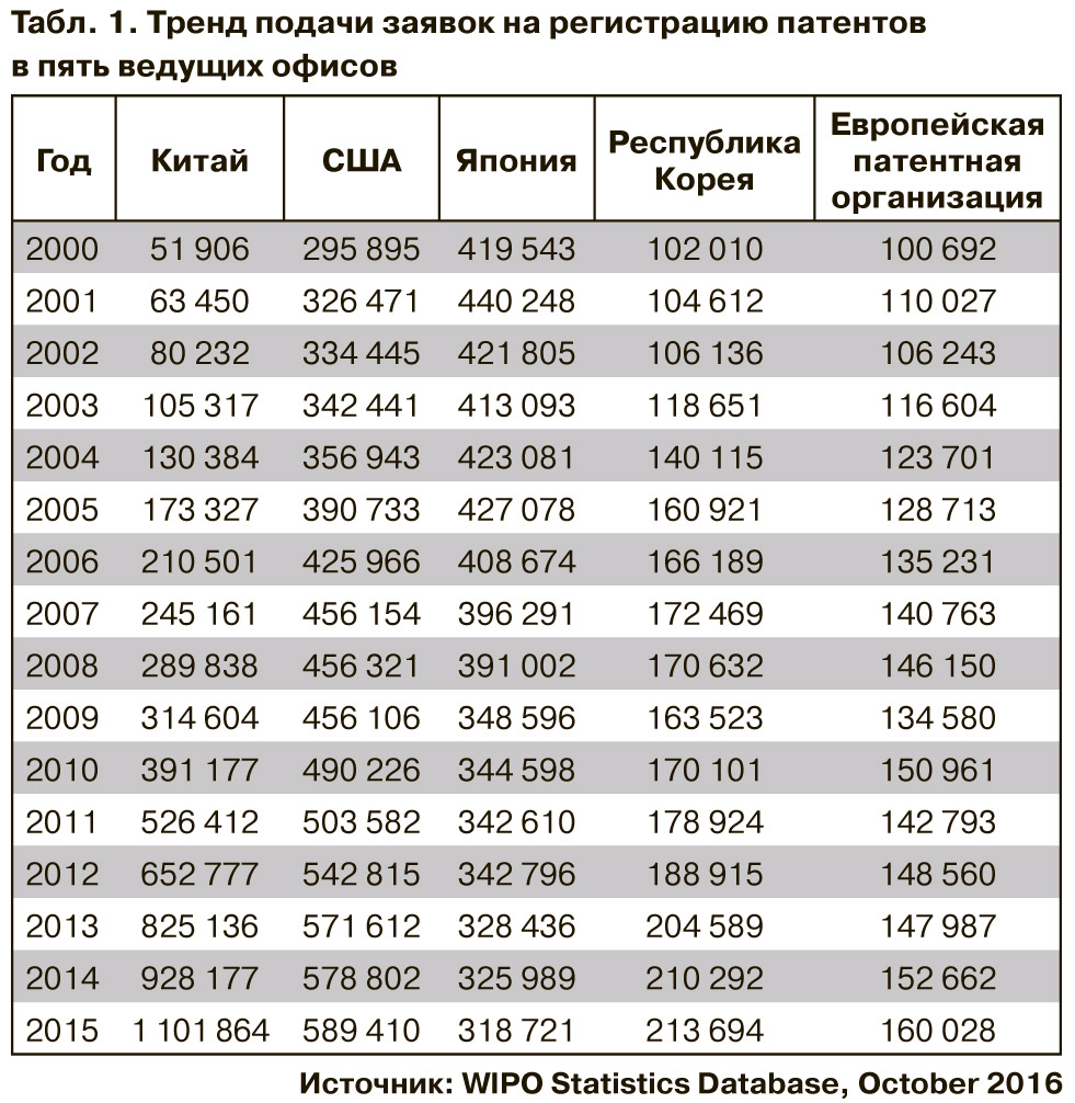 Беспокойство некоторых специалистов развитием событий понятно. Они оценили, что США стремительно теряют свои лидерские позиции в технологическом развитии. Так, несмотря на существенно большие вложения в исследования и разработки (R&D), по сравнению с другими странами, и КНР в том числе, США уже, кажется, понимают, что битву за будущее лидерство в технологическом развитии они с треском проиграли, а эффективность китайской науки значительно выше американской. Меньше вкладывая в исследования и разработки, Китай обеспечивает значительно большее количество патентов в год, - а следовательно, будущее мировое лидерство в технологическом развитии будет принадлежать Поднебесной. Поскольку интеллектуальная собственность (ИС) является индикатором будущего технического прогресса и по ее показателям можно судить о будущем развитии страны, то сравнительный анализ динамики ИС позволит сделать выводы о будущем той или иной страны. В 2011 г. Китай впервые опередил США по количеству подач заявок на патенты (почти на 4%). С тех пор КНР стремительно и неуклонно наращивает количество ежегодных поданных заявок на патент, укрепляя свое мировое господство в этом вопросе, тогда как США прогрессируют значительно медленнее. Так, в 2015 г. из поданных изобретателями всего мира около 2,9 млн патентных заявок 1,102 млн были поданы в патентное ведомство Китая. То есть свыше трети мировых заявок обеспечивает КНР. Почти столько же заявок получили три вместе взятых патентных ведомства: США (0,589 млн ), Японии (0,319 млн ) и Республики Корея (0,214 млн ). Европейское патентное ведомство смогло получить только 160 тыс. заявок. Выйдя в 2015 г. на рубеж в 1 млн заявок в год, КНР и в 2016 г., по предварительным данным, сумела выдать свой миллион. А в целом, с 2000 г. КНР почти в 20 раз увеличила объемы своего патентования, тогда как США - чуть более чем в 1,9 раза (см. табл. 1).