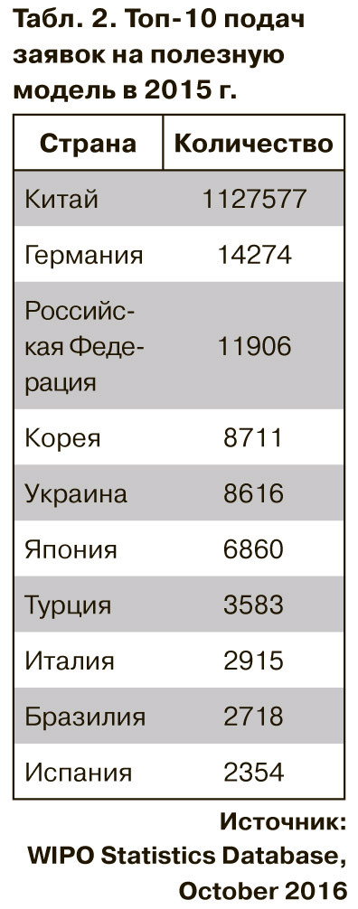 С полезными моделями ситуация аналогична. От всего количества мировых заявок 2015 г. - 1,2 млн - на Китай приходится 1,1 млн, то есть свыше 93%. Подача заявок на полезную модель вообще не получила распространения в США (см. табл. 2).
