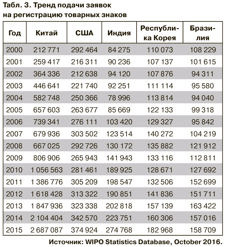 В том же 2015 г. во всем мире было подано около 6 млн заявок на регистрацию товарных знаков. Из них 2,69 млн, то есть почти 40%, поданы в патентное ведомство Китая. В США подано