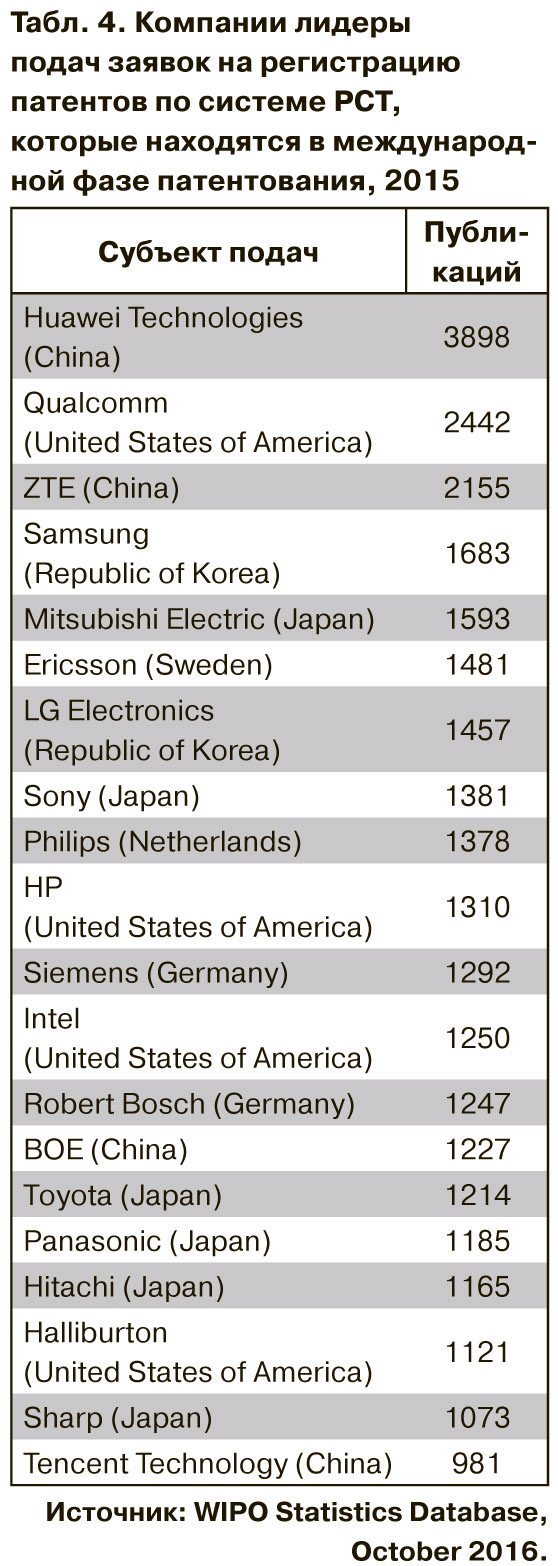Такая же ситуация и с патентованием мировыми компаниями-лидерами. По данным Всемирной организации интеллектуальной собственности (ВОИС), в 2015 г. по патентам, вошедшим в международную фазу патентования по системе РСТ, в первую двадцатку мировых компаний входило по четыре китайских и американских компаний. Первое место с очень большим отрывом занимала