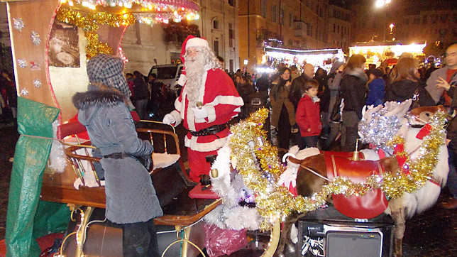 На протяжении рождественско-новогодних праздников нельзя обойти стороной и площадь Навона. Когда-то Юлий Цезарь построил здесь стадион. Нынче площадь известна знаменитым фонтаном четырех рек и художественными вернисажами. А зимой римлян и гостей столицы больше всего манит сюда рождественская ярмарка. Чего здесь только нет! Сладости, игрушки, сувениры, картины, посуда, елочные украшения, статуэтки и детали для вертепов, сапожки, чулки и валенки для подарков.