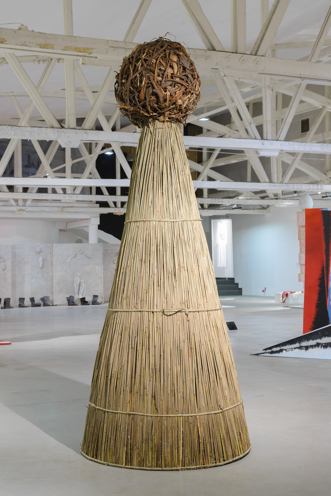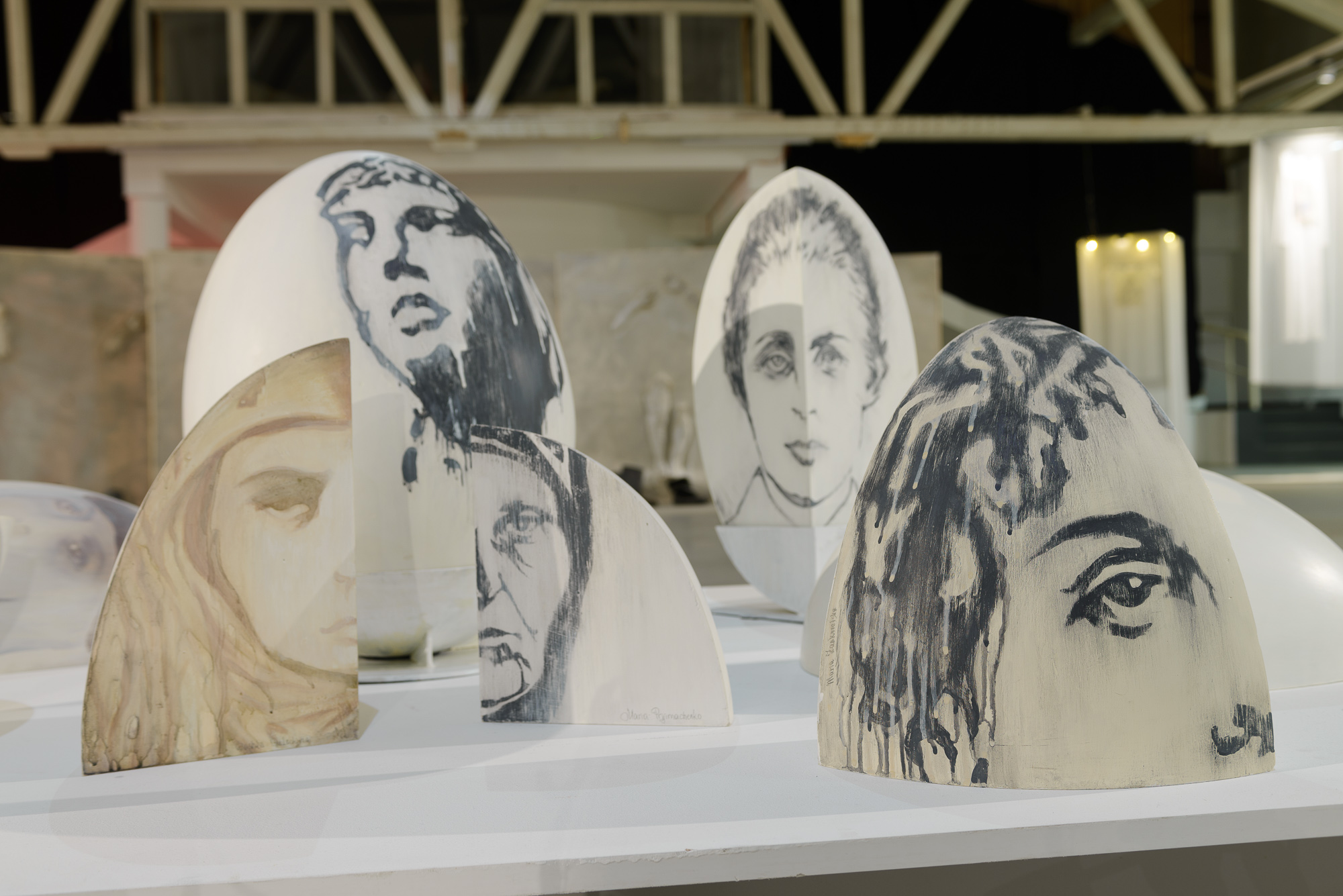 Простір "Лаври" цими днями чимось скидається на масштабний павільйон, який обживають елементи якоїсь вишуканої театральної сценографії з різних вистав від різних режисерів та художників. Усередині білого простору - і червоні контури нанизаних на шампури журнальних сторінок під назвою Red Paper; і холодні елементи військової техніки, залиті білою фарбою White tears (Білі сльози); і золоті колоски з проекту "Наші баби". І багато іншого, що різними роками народжувалося в рамках її проектів Mute, "Трансформація", "Чорне намисто", "Осінь така мила" та інших.