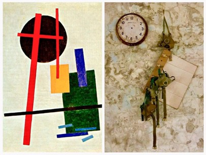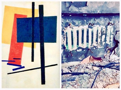 Два роки тому я відвідала Чорнобильську зону відчуження. Прип'ять - місто-привид, від якого залишився тільки скелет - каркаси колись житлових масивів. Усвідомлення масштабу глобальної катастрофи, а також локальної, тієї, що спіткала жителів цього міста, побудованого, щоб стати місцем проживання молодої наукової еліти, мене вразило. Тільки за кілька місяців я зважилася повернутися до фотографій, які зробила під час поїздки. Одна з них, де камера зафіксувала круглі настінні годинники без стрілок, дерев'яні рейки з цвяхами, на яких висять гумові протигази, чітко злилася в моїй свідомості з картиною "Супрематизм" Казимира Малевича. Я відшукала її в інтернеті й поєднала фото і оцифровану картину в колаж. Просторова подібність мене здивувала: ритм, співвідношення форми збігалися до дрібниць. Супрематизм Малевича, як маніфест модерну, мобілізації творчих сил "нових людей", і фотопам'ятники атомного розпаду тоталітаризму, покладені поруч, постали жахливою своєю правдоподібністю візуальною епітафією радянській імперії.