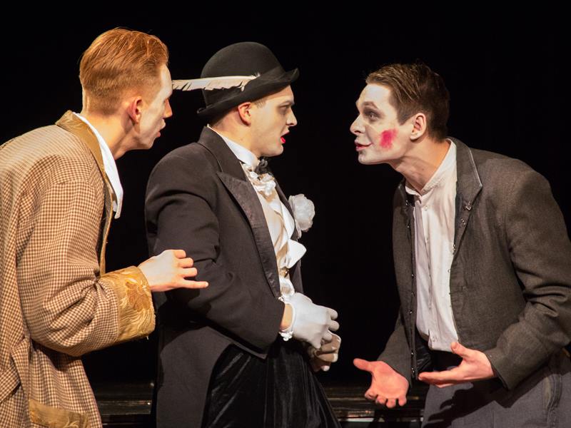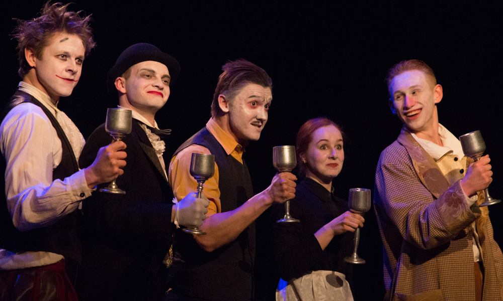 Звичайно, не до "смерті", але, безперечно, захоплено і майстерно веде різні інструментальні теми в музичній скриньці шекспірівський Блазень (Олександр Бегма). Він - акомпаніатор, він же - і "дегустатор" шекспірівського зілля, яке заварюють на сцені його друзі-студенти. Блазень-піаніст інколи принюхується до дивного шекспірівського банкету, до богомазовської вистави-концерту, в якій його друзі, кожен по-своєму, пропонують свої виграшні номери. Коли треба, цей-таки Блазень може гучним або приглушеним мотивчиком додати солі, цукру чи перцю у сценічну дію в тому ж таки чорному кабінеті.