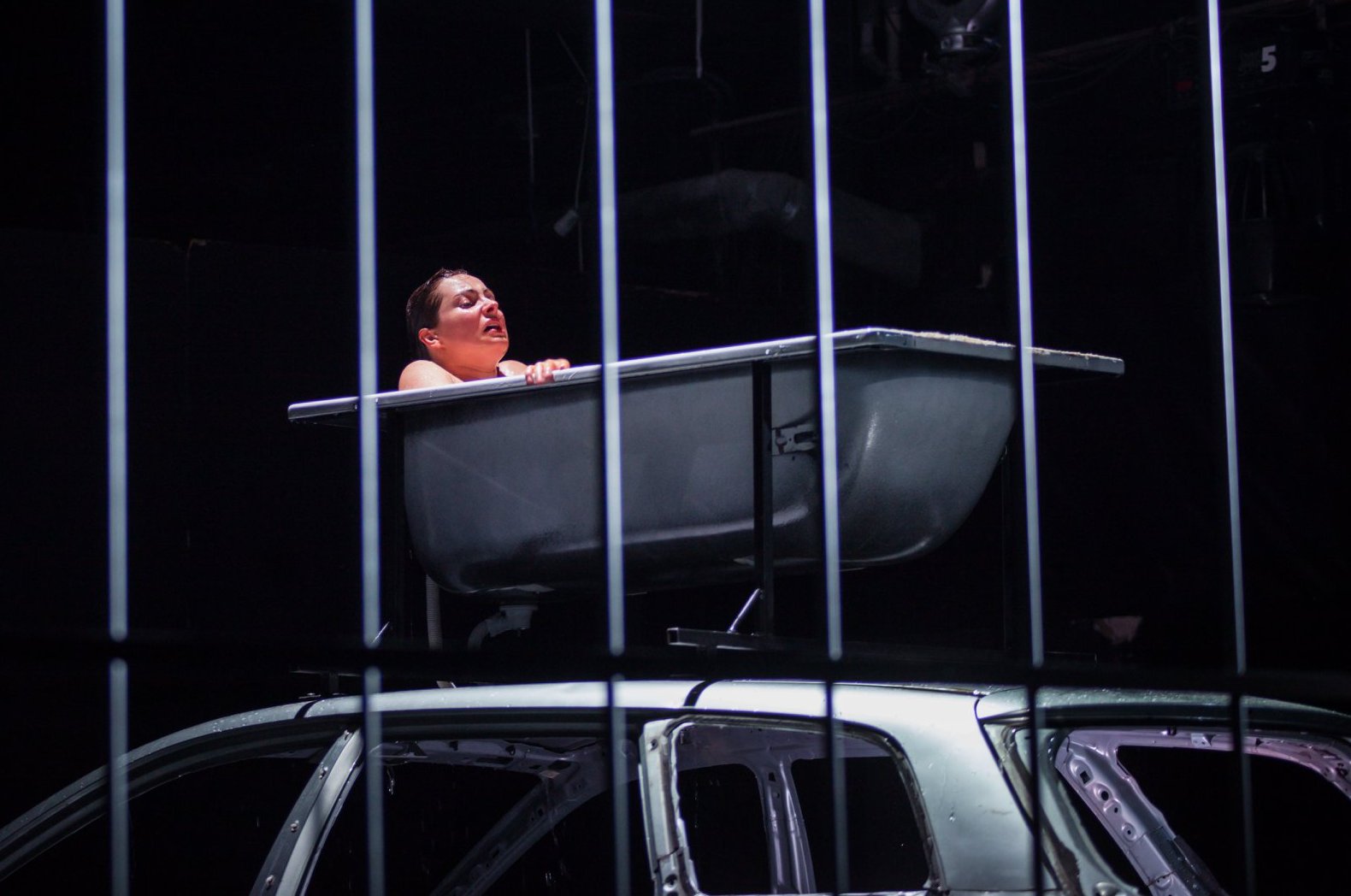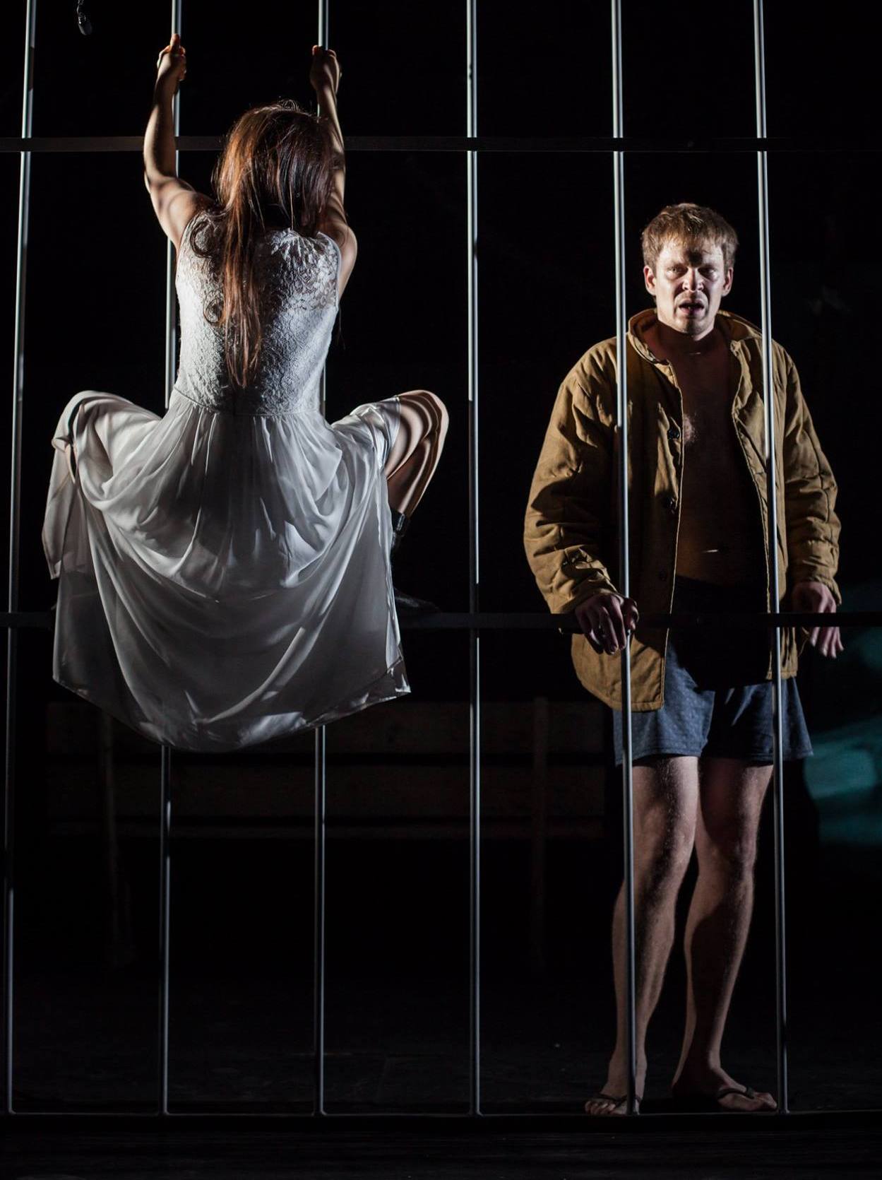 А під раєм, зрозуміло, пекло. Сцену відділено від глядача високим металевим парканом, через який одні хочуть перелізти, а інші так і залишаються всередині перманентного пекла - з його розбитими дорогами, роздовбаними машинами, іржавими ваннами.