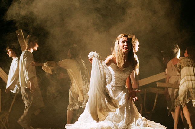 Ще один контраст - "Лісова пісня" театру ім. Леся Курбаса. Спектакль, уже оповитий терпким серпанком легенди, визнаний одним із головних сценічних одкровень нового століття. Кілька років тому Андрій Приходько розкрив Лесю Українку не тільки крізь обряд і чарівність фольклорних мотивів, а й крізь злий публіцистичний накип. Коли свого часу вперше побачив цю "Пісню", вона сприймалася як застереження. Тепер це чи не вирок. Спектакль тим часом дихає, росте, не маліє, як шагренева шкіра, а випромінює нові смисли й рими.