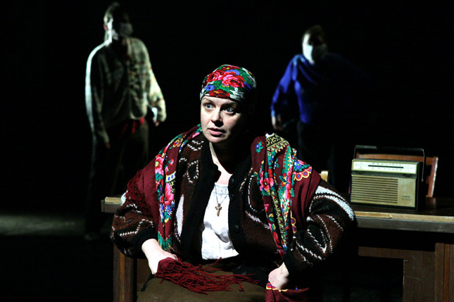 Удома, на малій сцені Молодого, артисти грають про маленький космос, який для кожного - батьківщина. Хай і забруднена радіонуклідами, але своя, єдина. На новому майданчику (а це величезна сцена івано-франківського театру) маленький космос вимушено розверзається - і переходить у стан космічної нескінченності. У вигляді безберегого задника сцени. Вітовська, як завжди хвацько, підкорює собі й цей космос...