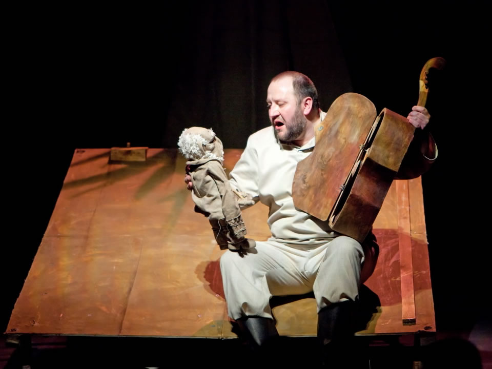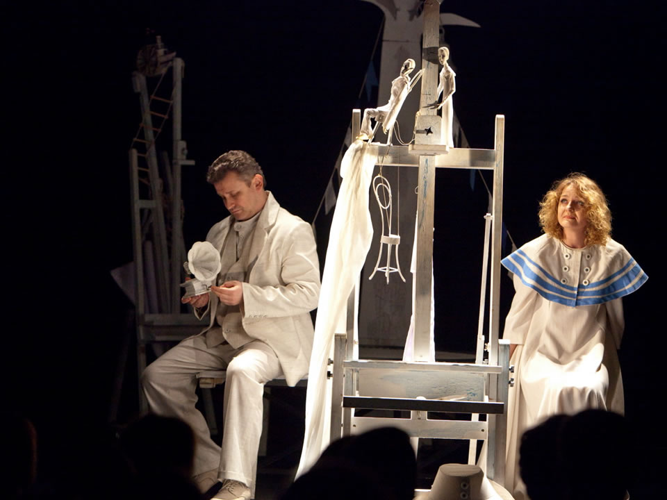 Перший план у виставі - актори драматичні (В'ячеслав Гіндін, Геннадій Гуриненко, Олександр Коваль, Тетяна Тумасянц, Наталія Шапошникова, Вікторія Міщенко). План другий - маленькі іграшки, безмовні істоти, що нагадують хитрих бовванчиків з індійських крамничок.