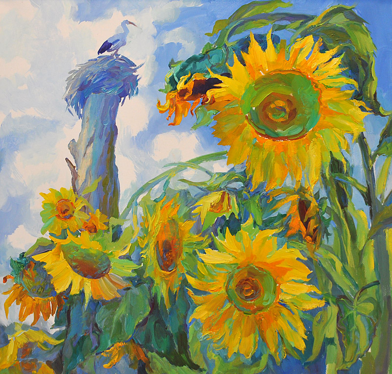 - Наразі перебуваю в Чернігівській області - біля Десни. Тут несказанна краса! Я - садівник-перволітка, але сама посадила гігантські соняшники, поливала їх. Це жива натура. А одного разу поставила етюдник біля соняшників, стала між ними, видушила фарби. І в цей момент почався ураган! Соняшники поламалися, довелося малювати їх в уже зібраних букетах.