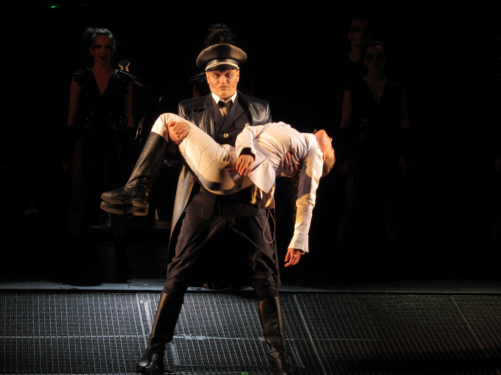 Отже є відвертий, а подекуди навіть зухвалий "шоу-біз" у різноманітних його віддзеркаленнях - від навмисно концертної сценографії до окремих сольних номерів. Поданих у виставі іноді як номери саме концертні, з блискітками й костюмними перверзіями, які пасують естрадним дівам (ідеально в цьому сенсі одягли короля, якого грає Арсен Курбанов).
