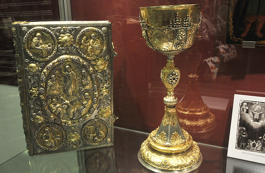 Фантастичної краси автентичні тканини, включно з коштовною парчею, сусідять із численними іконами, портретами гетьманів (із колекції НХМУ), дерев'яними різьбленими статуями, церковним начинням, різьбленими скринями, коштовним і дешевшим автентичним посудом.