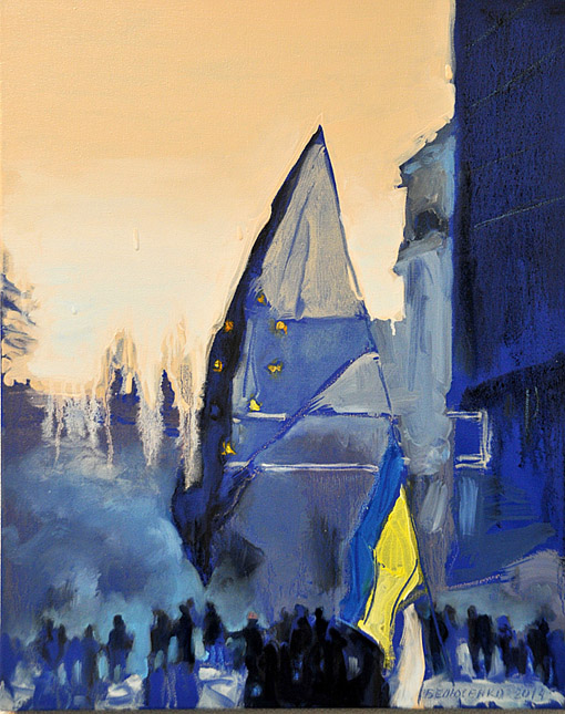 - Так, я багато чого бачив і далеко не все в цьому напрямі сприймаю. Я сам виходив на Майдан не як художник, а як людина. Але художник - така істота, котра не може не писати. У мене впродовж кількох місяців цвяхами вбивалися ті враження Майдану, тому було необхідно і видати щось. Картина - це образ, спроба передати враження, яке мене мучить. Якщо я щось побачив, і це зорово запало мені в мозок, то мені дуже треба донести це до інших. Навіть не намагаюся ці картини продавати. Уявіть, навіть не пригадаю зараз, яку роботу писав раніше, яку - пізніше. Це неважливо. Скажу, що в цій темі я повністю вичерпався.