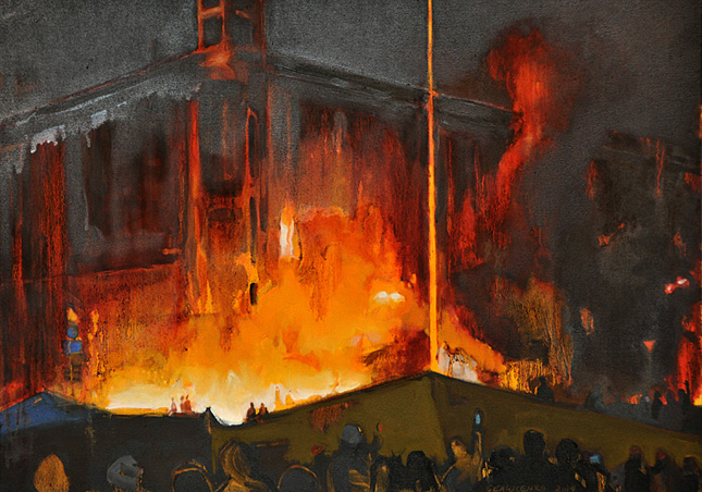 Причому сам художник не приховує, що "художнє" зміщується на другий план, поступаючись місцем темам подієвим, драматичним, які стали вже історією. На полотнах художника - пожежі, люди, танки, прапори… Весь контекст революційних подій у деталях та образах.