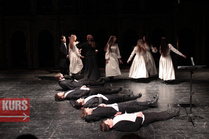 Актори-читці-ченці (Олексій Гнатковський, Надія Левченко) - праворуч і ліворуч (на крилосі) - читають тексти Стефаника саме як молитву, як Святе Письмо. А з ікон - до матері - летять, як білі голуби, її діти у білих сорочках. Вже коли вона проводжає їх - одного за другим, - ці проводи перетворюються в нескінченний ритуал. На білі сорочки синів лягає новий чорний одяг. І вона (мати і земля), раз у раз, як мантру, повторює одні й ті самі слова. Бо ж над білими голубами скоро закружляє чорне вороння (вона знає).