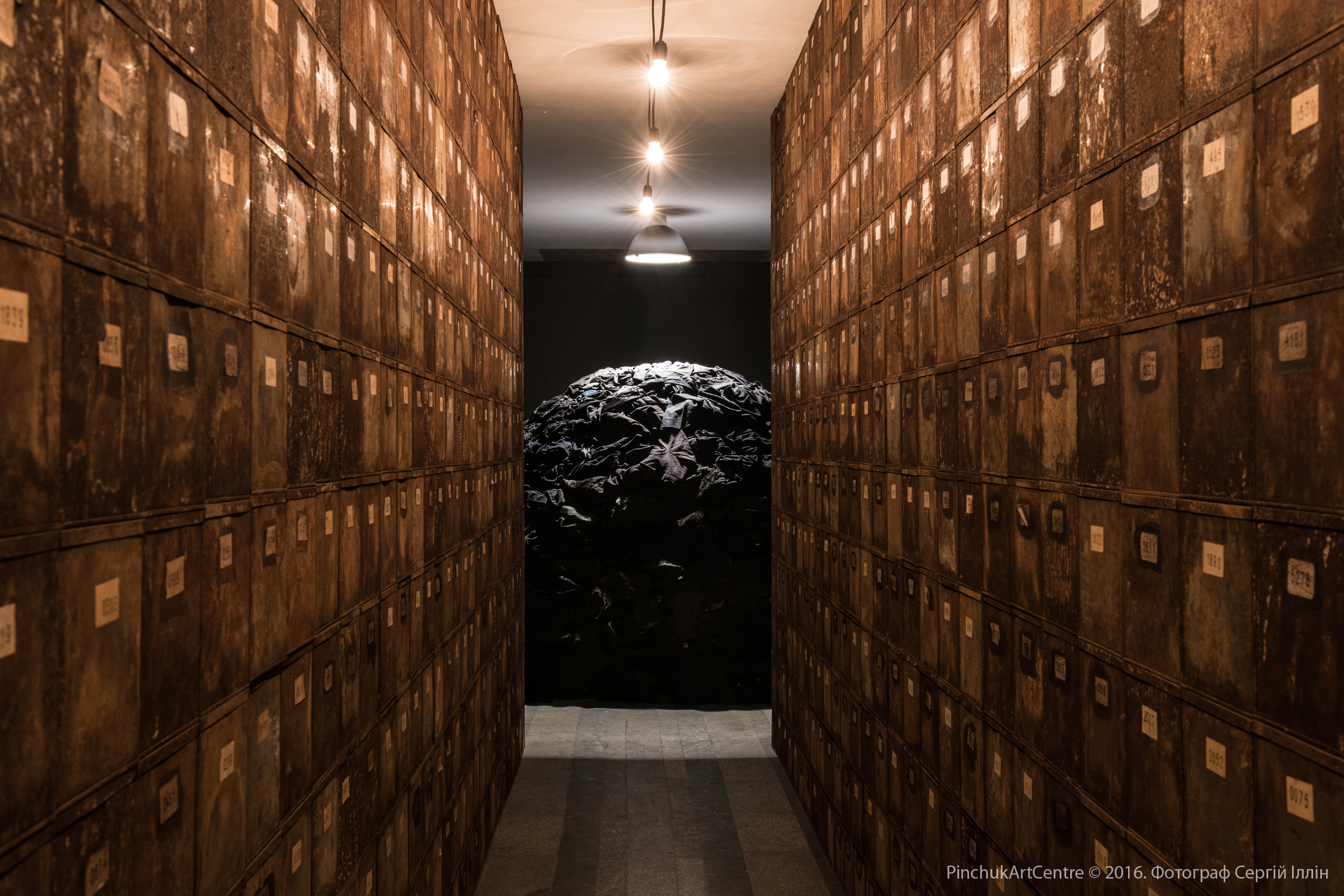 Ти просто йдеш - здається, що нескінченно - вузьким, погано освітленим, звивистим коридором. Стіни якого складені з сотень залізних ящиків, пронумерованих, як в архіві. "У таких зберігали документи й цінності. З такими, на думку Болтанскі, євреї 75 років тому йшли під конвоєм у Бабин Яр", - пояснює куратор виставки Бйорн Гельдхоф.