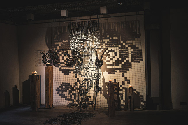 Виходить, що це мегавізерунок, він наче "збільшений" у комп'ютерних пікселях. На задньому плані в галереї - образ кози, всі частини якої, як і годиться, виконано також із гуми - і роги, і вуха, і бороду.