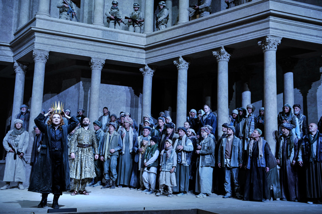 Очевидно, режисер прагнув відтворити на сцені таку собі узагальнену картинку актуальних світових подій, вплітаючи їх у трагедію нападу вавилонського царя Набукко на Єрусалим.