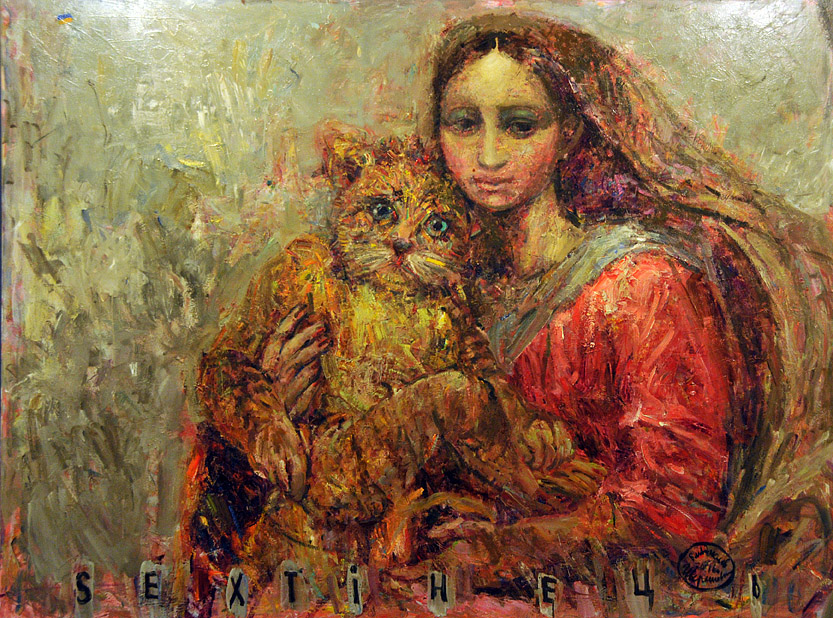Ще одна його картина - "Sexтінець": вродлива жінка з котом. "А тут у мене два найпопулярніші персонажі в FB - котики й мадонни. Ну, нехай мадонни не в нас, а в католицькому світі! Але ж ми, проте, в Європу хочемо. Це ж гра. Гра художника, який хоче подобатися".