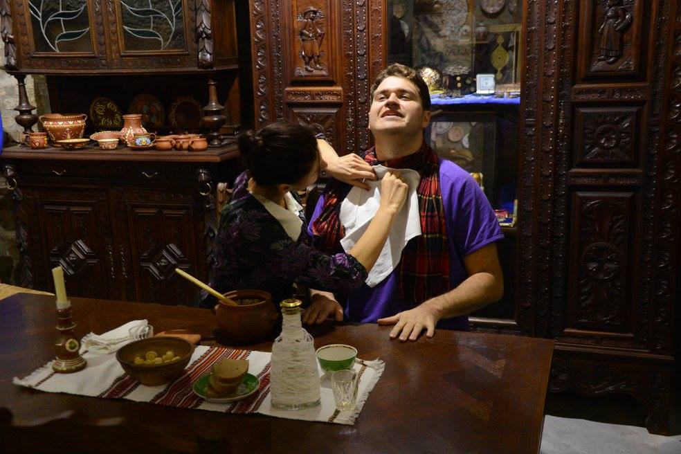 Слід зазначити, що партії скрипок у цьому півгодинному етюді - Афанасія Івановича і Пульхерії Іванівни - виконані солістами Національного театру оперети (а не, скажімо, Національного театру ім. І.Франка). Кирило Басковський і Оксана Прасолова тим часом показали себе цікавими драматичними артистами. Гоголь не опирався їхньому напорові й емоційності. Обоє грали тему споріднених душ, що здригнулися в якийсь момент перед неминучістю земної розлуки. І ці дві бентежні душі вели за собою лабіринтами підвалу зграйку глядачів-свідків. Перетворювали камерну сповідальну історію Гоголя на подобу "ток-шоу", коли біль і любов двох людей - "все на виду, все на беду, все в этой роли одинокой" (як писала з іншого приводу Б.Ахмадуліна).