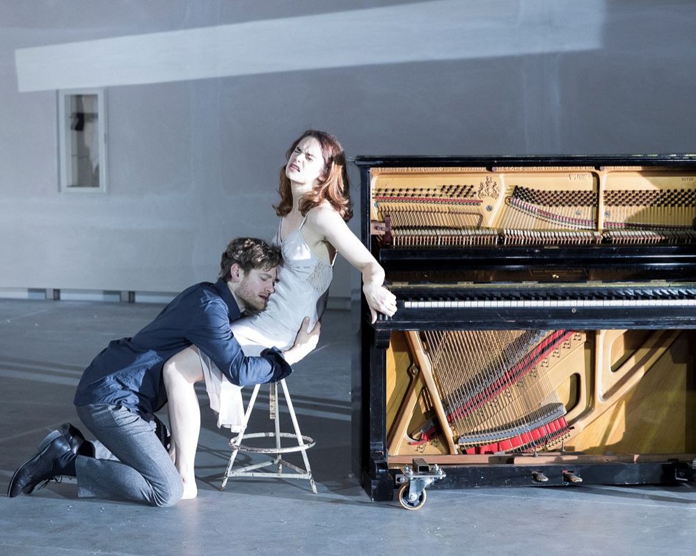 Саму Гедду режисер на початку дії буквально силоміць укладає спати - за рояль. Музика її душі поки ще дрімає, звук вимкнено. І вона сама спочатку відключена від того, що відбувається в лофті. Ні чоловік, ні тітка, ні наука, ні життя - ніщо не хвилює її. З нахабнуватою усмішкою вона тягнеться до єдиного вікна в будинку-акваріумі. І щось там пильно роздивляється.