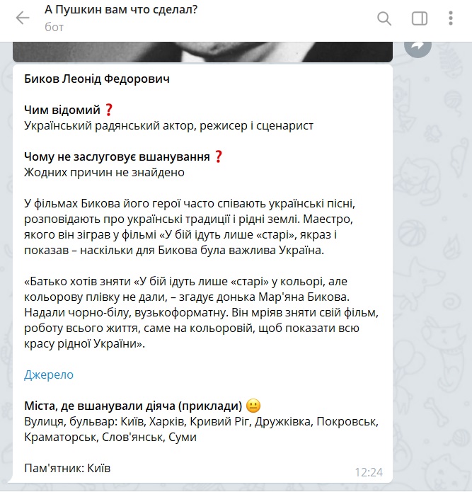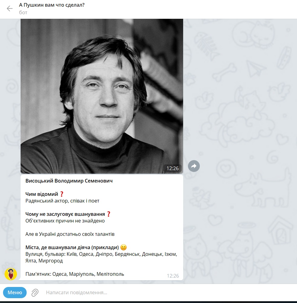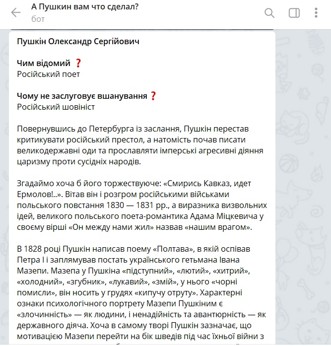 В Україні створили Telegram-бот, який пояснює, чому вулиці, названі на честь російських чи українських митців, слід перейменувати. Він отримав назву "А Пушкін вам что сделал?". У ньому також зібрані міста України, де встановлені пам'ятники тому чи іншому діячеві.