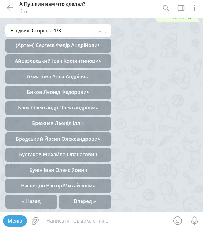 Так, у боті можна знайти алфавітний список діячів, інформація про яких міститься в ньому.