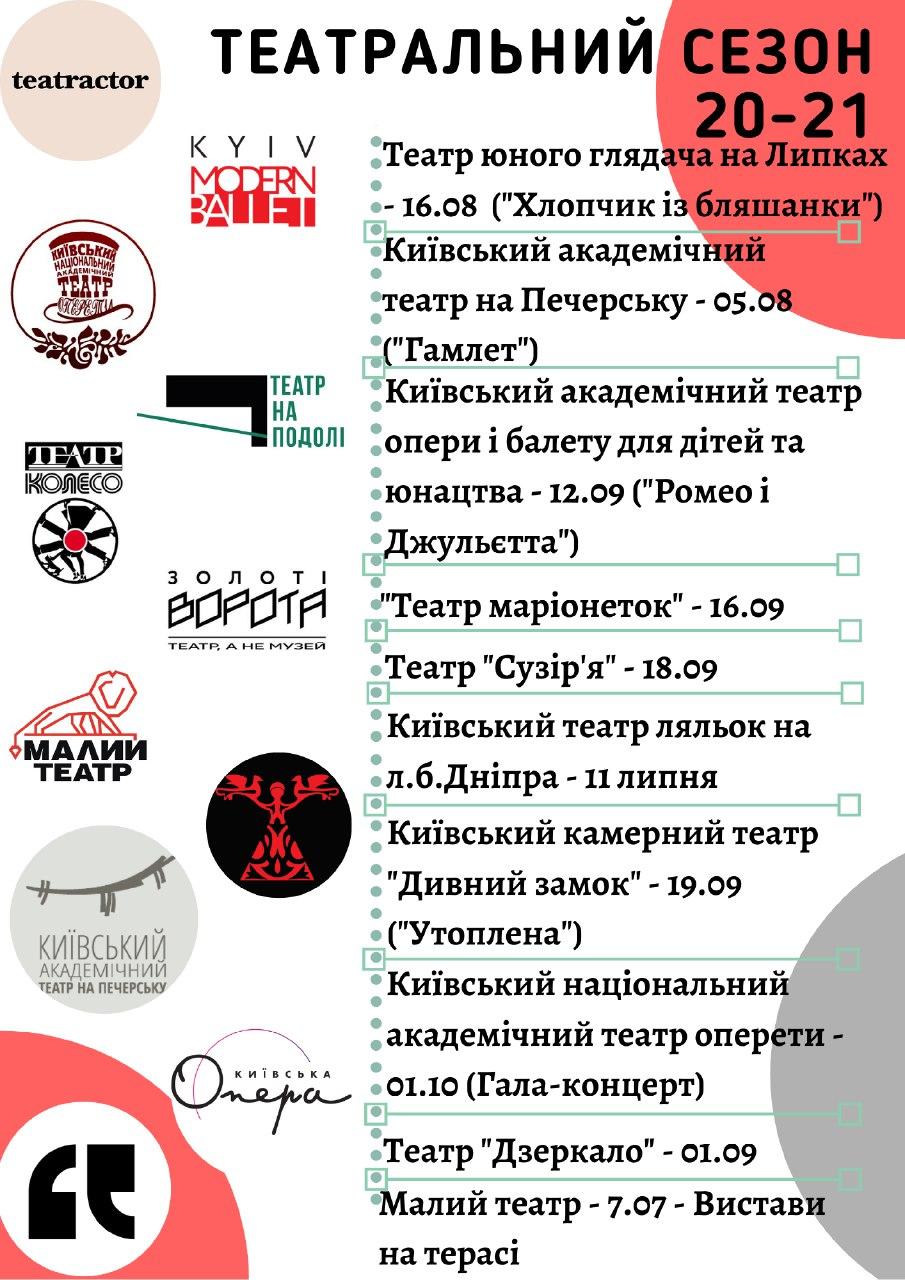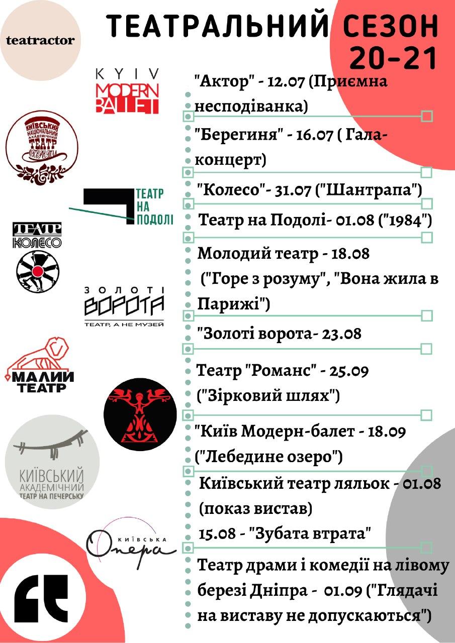 Першим буде театр «Актор»: на 12 липня заплановано виставу «Приємна несподіванка». Останнім сезон відкриватиме Київський національний академічний театр оперети - гала-концертом в оновленому глядацькому залі 1 жовтня.