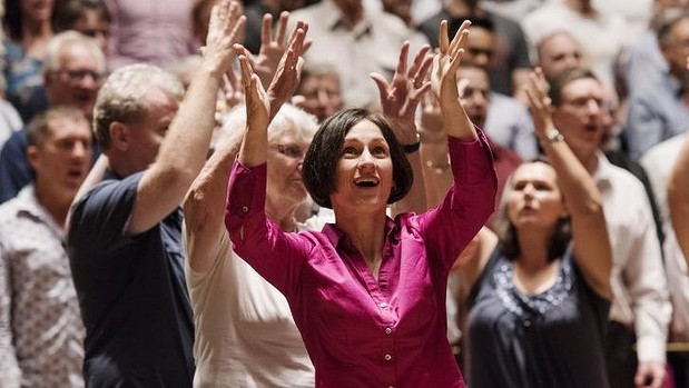 "Наприклад, глядачі побачать, як артисти з групи "Подай знак" піднімуть руки, зображуючи поперечини хреста. Одна половина хору буде направляти рух в одну сторону, інша - в іншу. Із залу це буде виглядати як розп'яття. Це зрозумілий і доступний для аудиторії візуальний символ", - каже Джонс.