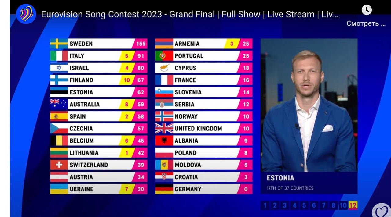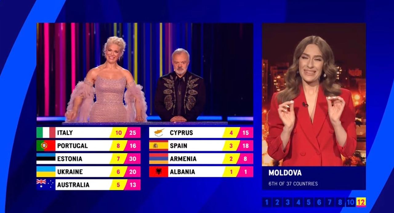 Далі йде Італія (10 балів), Естонія (7 балів), Ізраїль (7 балів), Молдова (6 балів), Латвія (4 бали), Азербайджан (2 бали), Литва (2 бали), Франція (1 бал).