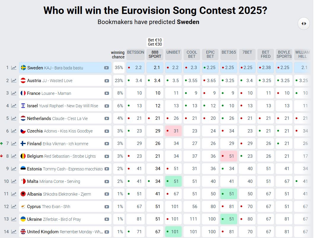 Трохи більш як за тиждень, 17 травня, у швейцарському Базелі відбудеться фінал «Євробачення 2025», Україну на якому представить гурт Ziferblat. Сьогодні букмекери пророкують перемогу Швеції із вірогідністю в 35%, вказано на сайті Eurovisionworld. Цього року Швецію на «Євробаченні» представляє гурт KAJ з піснею Bara bada bastu.