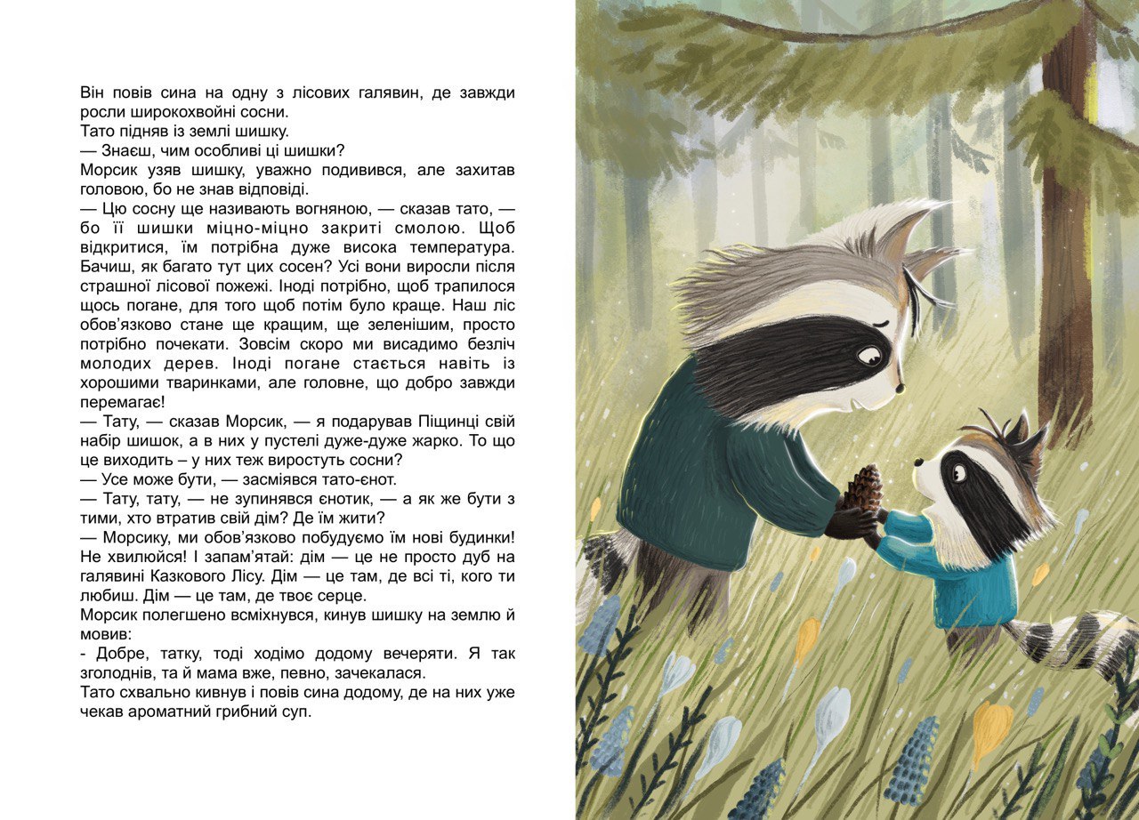 — Цю сосну ще називають вогняною, — сказав тато, — бо її шишки міцно-міцно закриті смолою. Щоб відкритися, їм потрібна дуже висока температура. Бачиш, як багато тут цих сосен? Усі вони виросли після страшної лісової пожежі. Наш ліс обов’язково стане ще кращим, ще зеленішим, просто треба почекати. Зовсім скоро ми висадимо безліч молодих дерев. Іноді погане стається навіть із хорошими тваринками, але головне, що добро завжди перемагає!