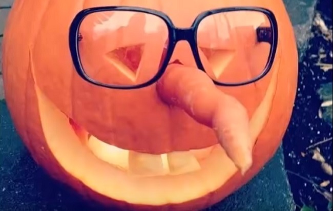 Для того, щоб зробити смішну мордочку з гарбуза, знадобляться морквина і старі окуляри. Спочатку ножем потрібно вирізати класичну пику з круглим отвором для носа, після чого вставити в нього моркву, а на очі вдягти окуляри.