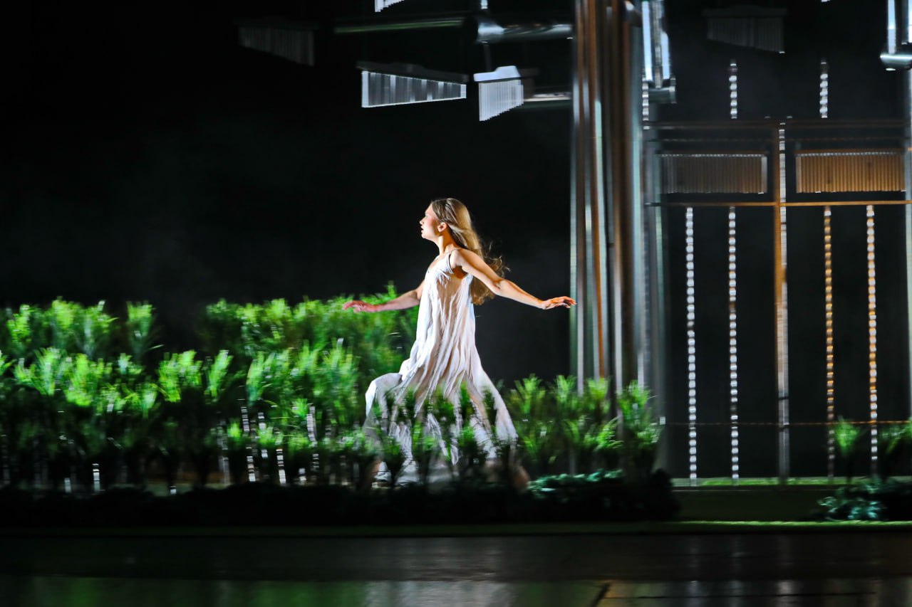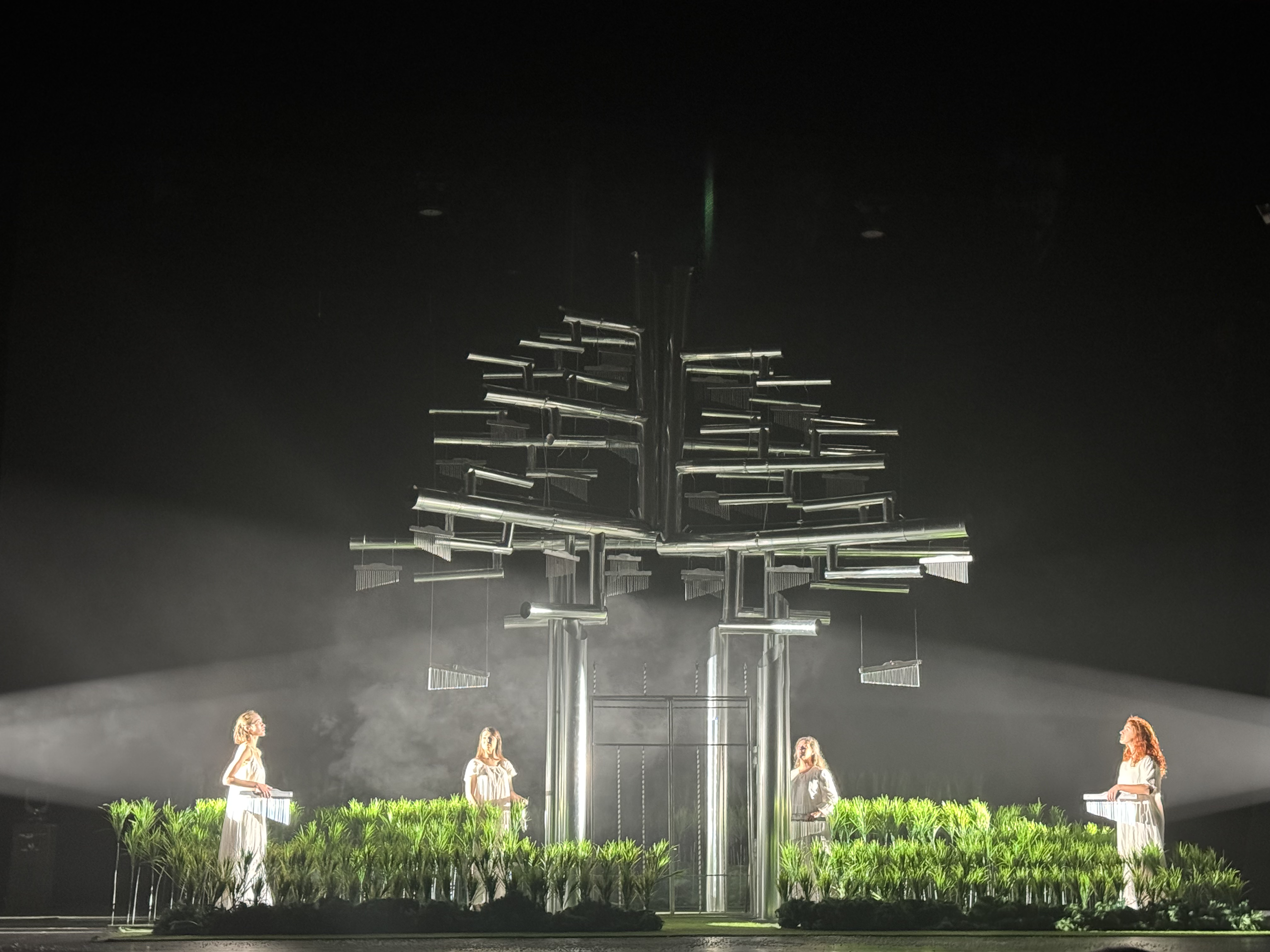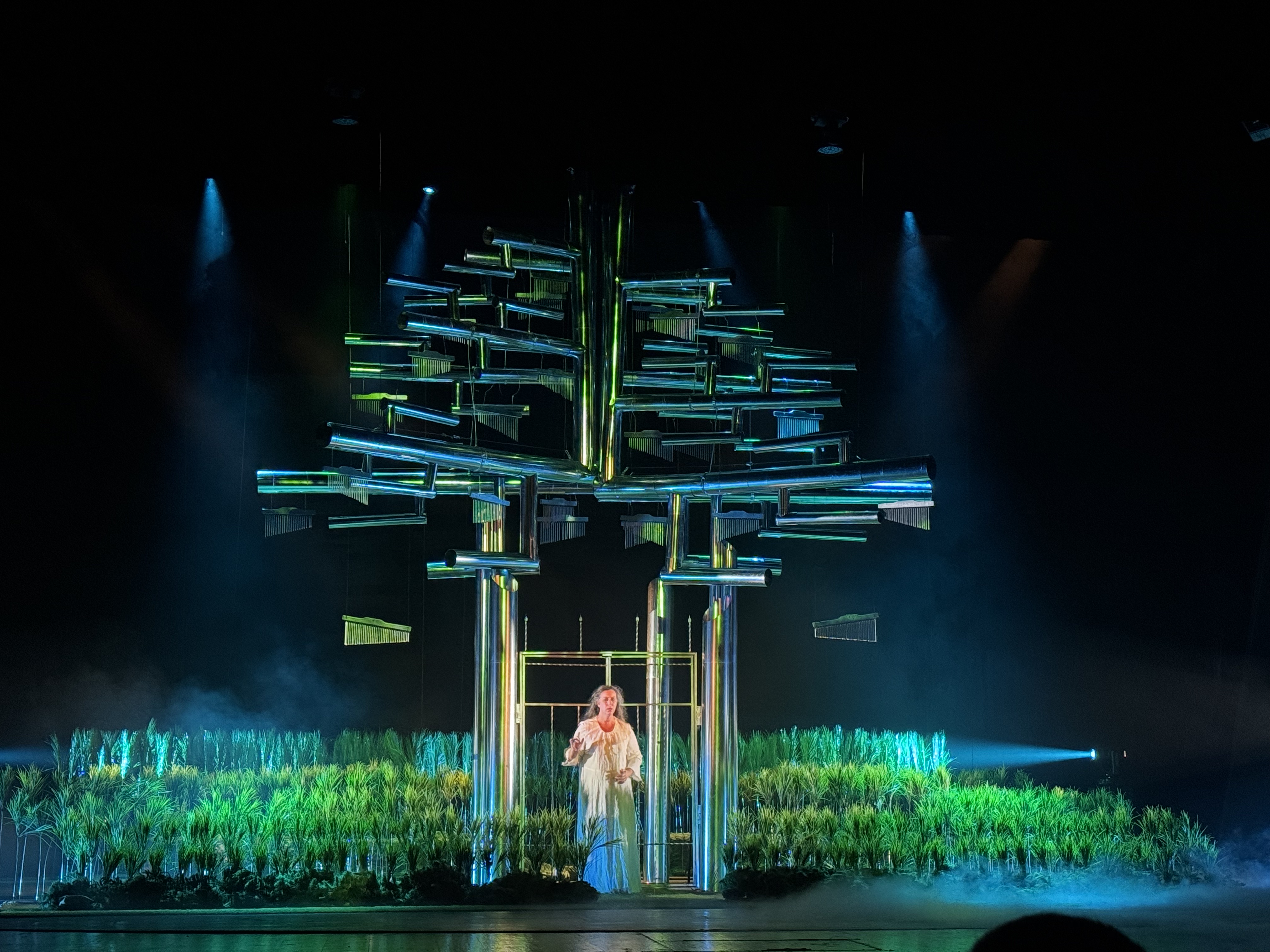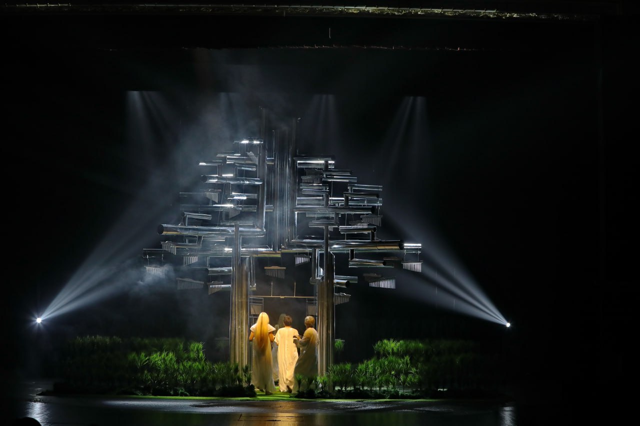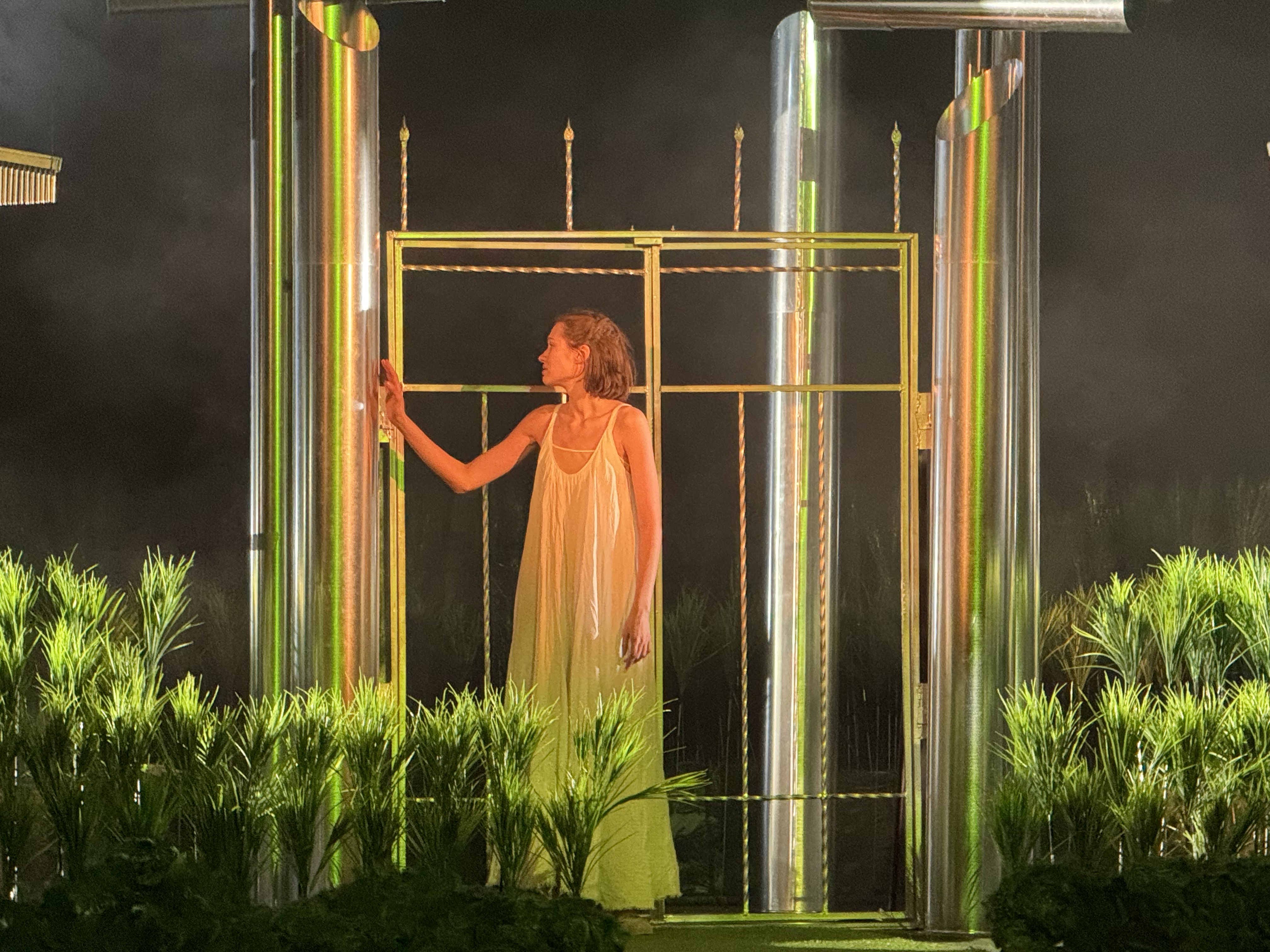 Глибину сцени закрито чорною завісою. І хоча буферну та дуже відносно безпечну зону — територію між сторонами, що воюють, — прийнято називати «сірою зоною», біля зупинки «Вирію» — лише тотальна темрява чорноти. Інших акцентів не буде, допоки не підніметься завіса. І в залі чутно нестримне «ого!». І є чому дивуватися. Перед глядачами у глибині сцени постає майже семиметрова чудернацька споруда, візуально схожа на казкове залізне дерево, по обидва боки якого «насаджено» яскраво-зелену рослинність. Ласкаво прошу до «Вирію».