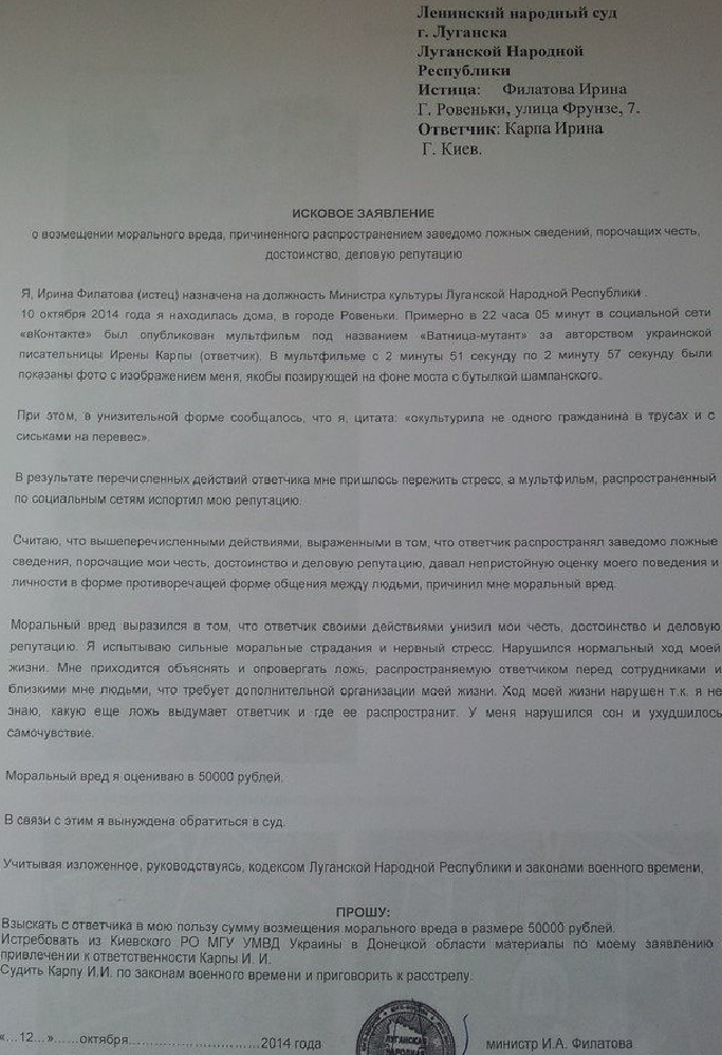 Крім розстрілу, Філатова вимагає стягнути з Карпи штраф у вигляді 50 тис. рублів за завдану моральну шкоду.