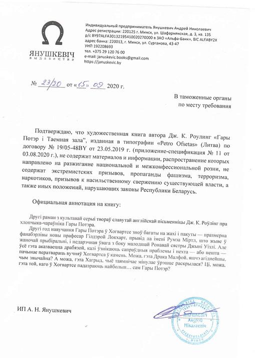 Співробітники «Янушкевич» підготували відповідну довідку і відправили її. Документ представлений в «Білоруську митницю за місцем вимоги». Вони повідомили про сюжет «Гаррі Поттера», а також те, чим відома ця книга.