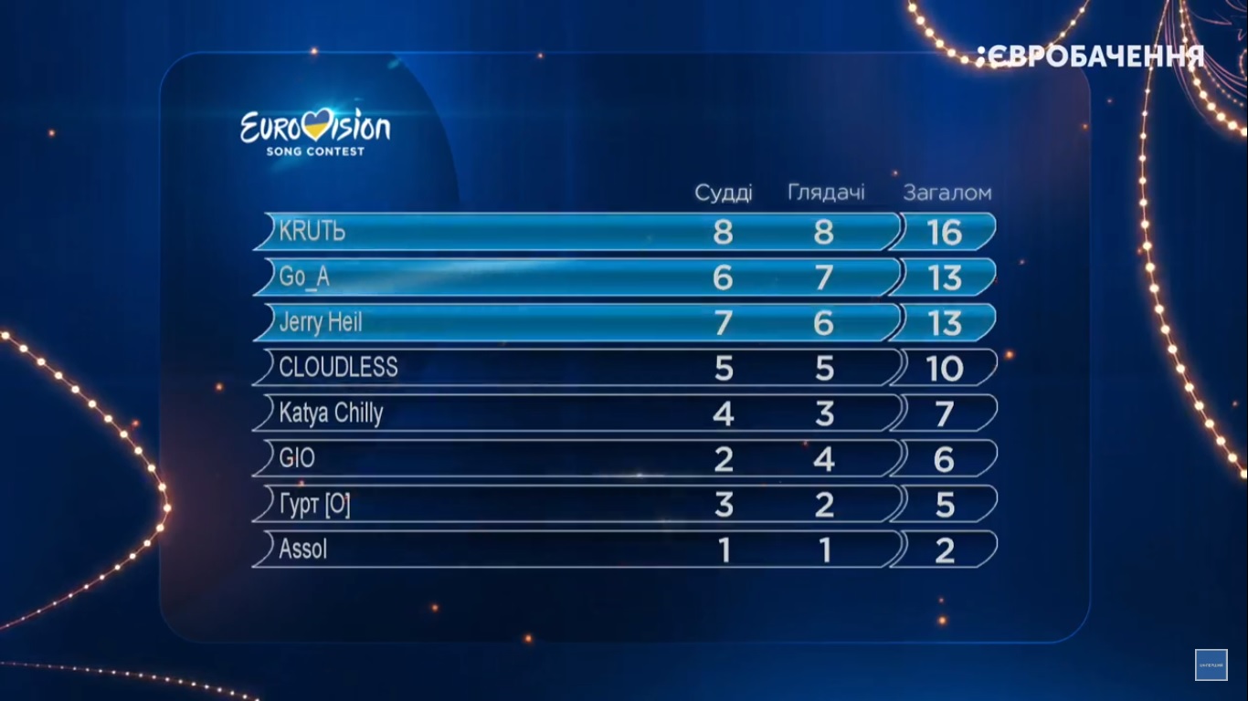 Найменшу кількість балів (1) і журі, і глядачі поставили співачці Assol. Найбільшу кількість балів (8) і ті, й інші віддали KRUTЬ.