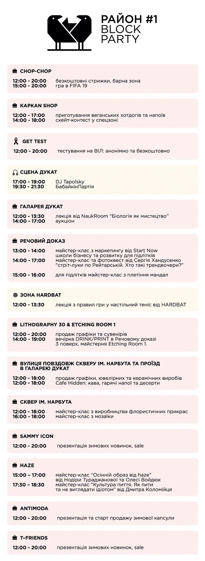 Організатори РАЙОН #1 Block Party, яка відбудеться 20 жовтня в Києві на вулиці Рейтарській, опублікували програму і таймінг події. Як повідомляється на сторінці вечірки на Facebook, основні заходи пройдуть з 12:00 до 20:00.