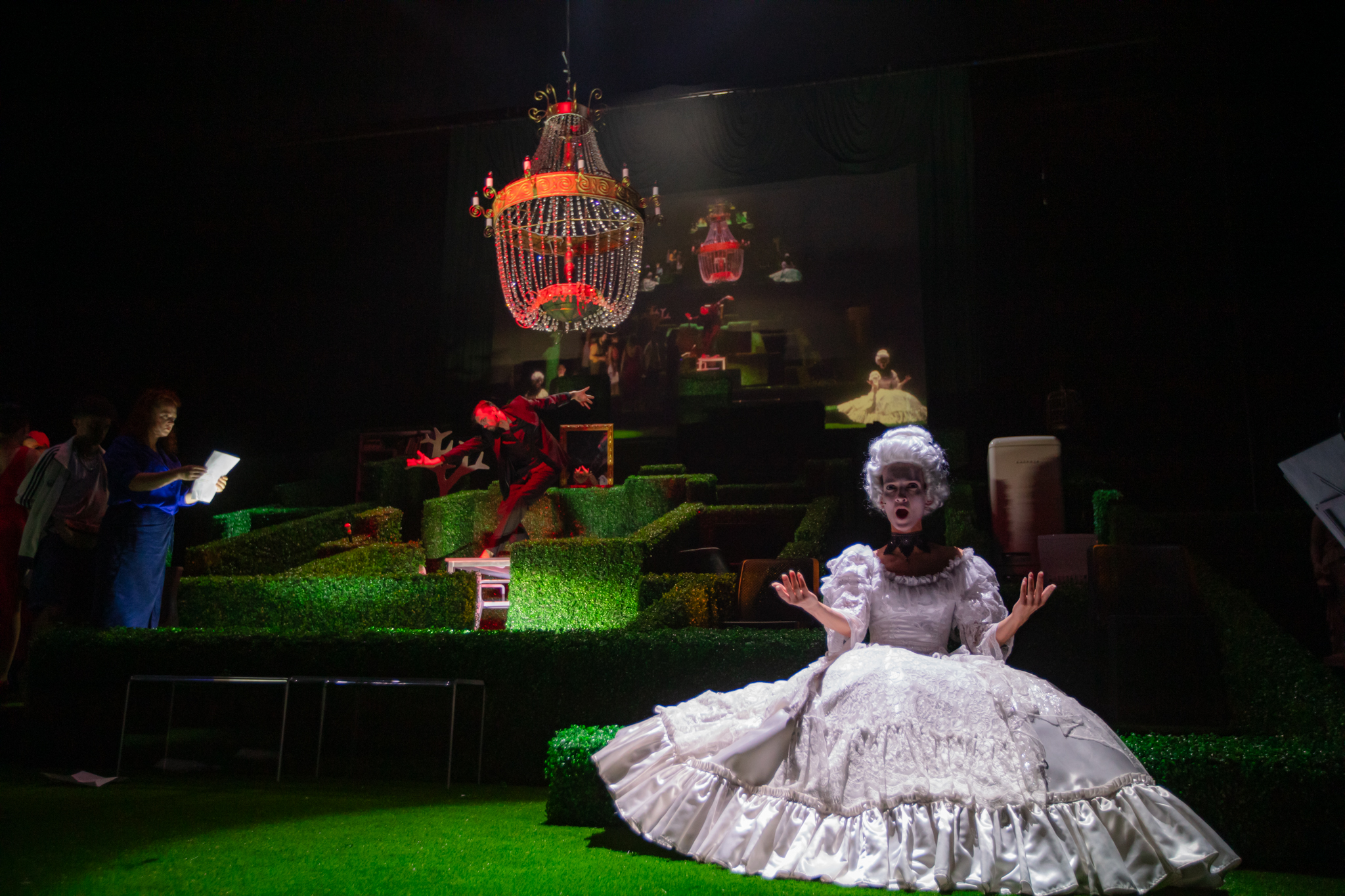 — За два місяці. Це короткий строк. Хоча свого «Гамлета» я рік ставив. Є, звісно, режисери, які довше ставлять. Зараз життя пришвидшилось, і терміни постановок також. До речі, якщо говорити про те, що «світиться постбароковим кітчем», то це умисно було зроблено. Це певний подразник. І Версальські діви, й скульптури на сцені (показує рукою на копії античних скульптур) спеціально зроблені. Все йде від французького Версалю. Це бажання здаватися багатими, навіть оці зелені паркани в декорації. «Тартюфа» ж було написано на відкриття Версалю, і це вперше люди зрозуміли, що таке «показники багатства». В цій виставі багато різних сенсів. Є й віртуальні лабіринти — соцмережі, в яких ми живемо, й не лише. В «Тартюфі» була складність, тому що я не йшов за старими схемами, оскільки ставив цю виставу раніше.