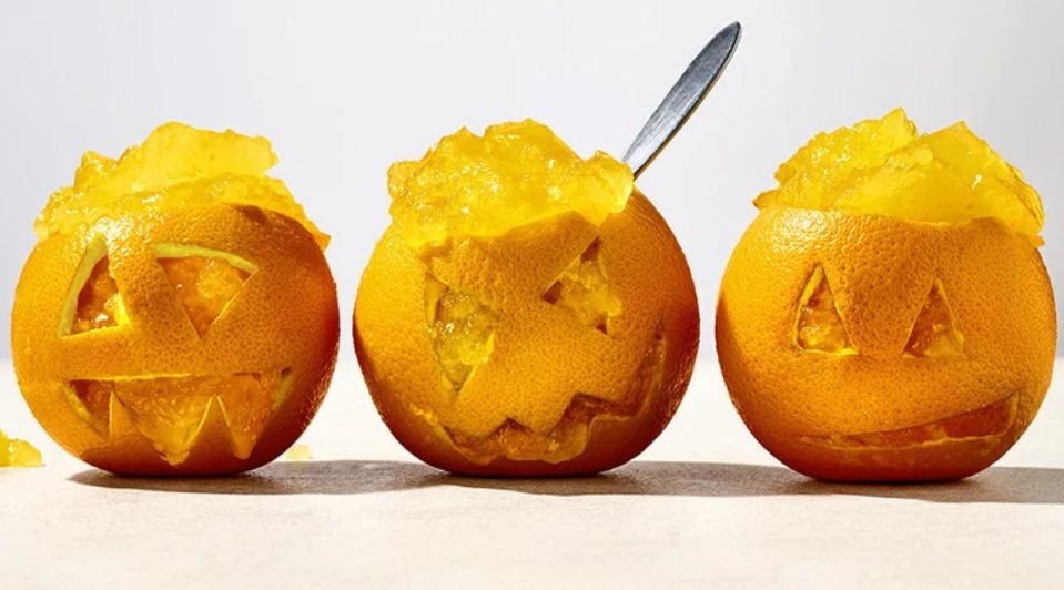 Коли ви будете готові до подачі, візьміть вилку і простягніть желе в листі, поки воно не стане м'яким. Викладіть суміш ложкою в апельсинові шкаралупи, обережно натискаючи ложкою, щоб вона виглядала так, як ніби вона випливає з отворів. Наповніть доверху і подавайте.