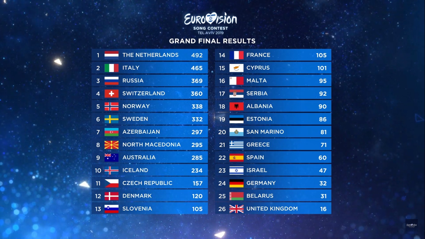 Переможцем Міжнародного пісенного конкурсу "Євробачення-2019" став Дункан Лоренс, який представляв Нідерланди. За підсумками голосування глядачів і національних журі він набрав 492 бала і посів перше місце.