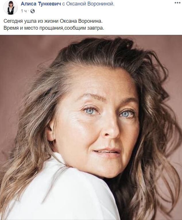 "Сьогодні пішла з життя Оксана Вороніна. Час і місце прощання, повідомимо завтра", - написала Аліса у соцмережі.