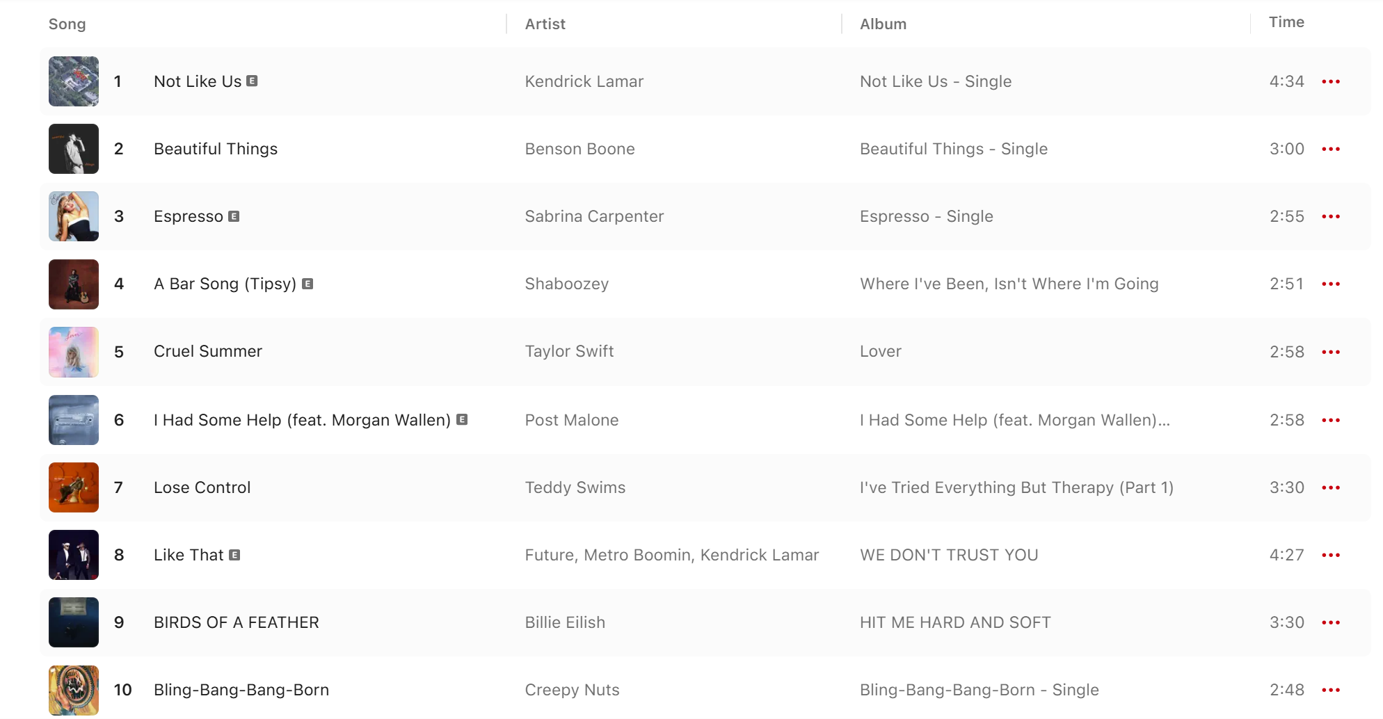 Водночас стрімінгова платформа оприлюднила список найпопулярніших треків у світі. Там серед виконавців, яких слухали найчастіше, опинилися Кендрік Ламар, Тейлор Свіфт, Сабріна Карпентер та інші. Перша десятка виглядає так: