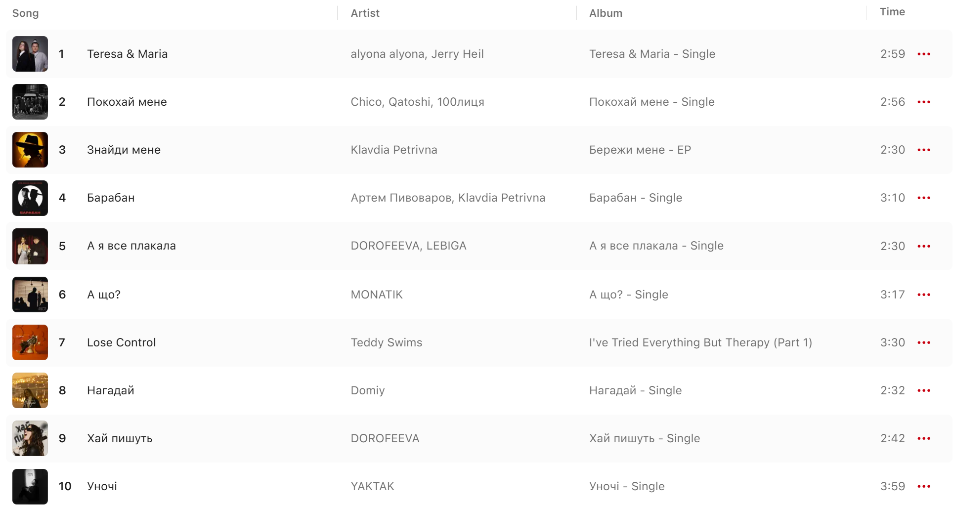 Перша десятка найпопулярніших пісень в Україні – це дев’ять україномовних треків і один англомовний. Перші 10 позицій виглядають так: